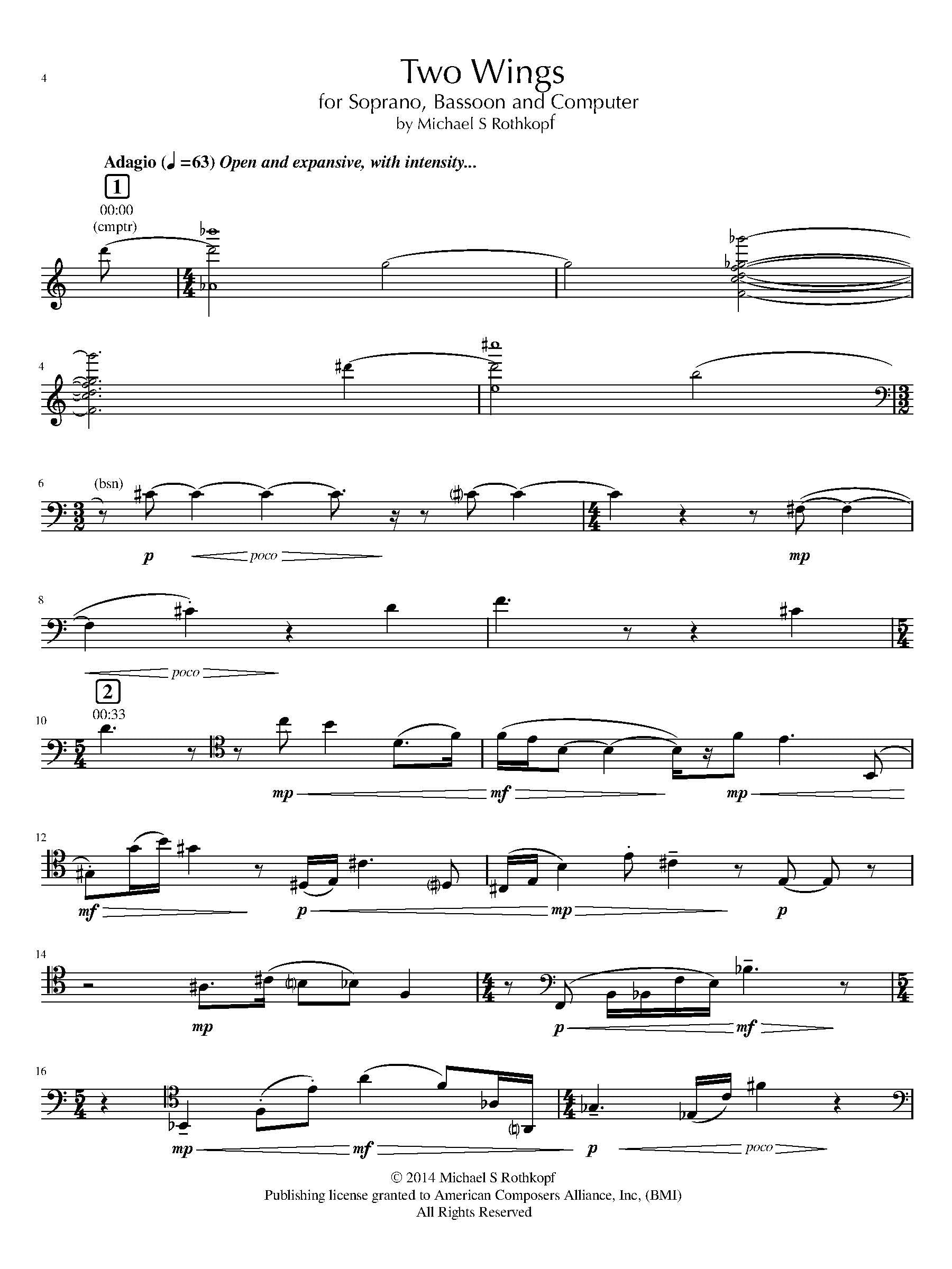 In setting “Las Alas” to music, I imagined the voice of the bassoon to represent the “wings” in a canonical call and response to the soprano as the voice of the poet.  At times the voice leads the saxophone and at other times the reverse.  Together they walk through a musical landscape conjured by the computer arriving at a collective improvisation based on the words and phrases of the poem in it’s original Spanish.  The work concludes with an awakening and dissolution of the “wings” and the music.