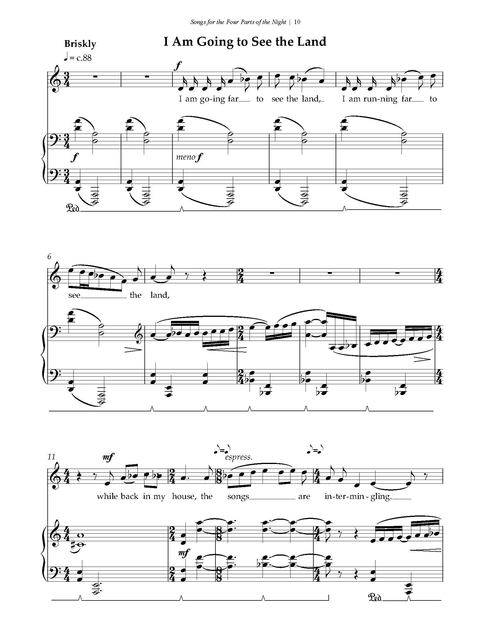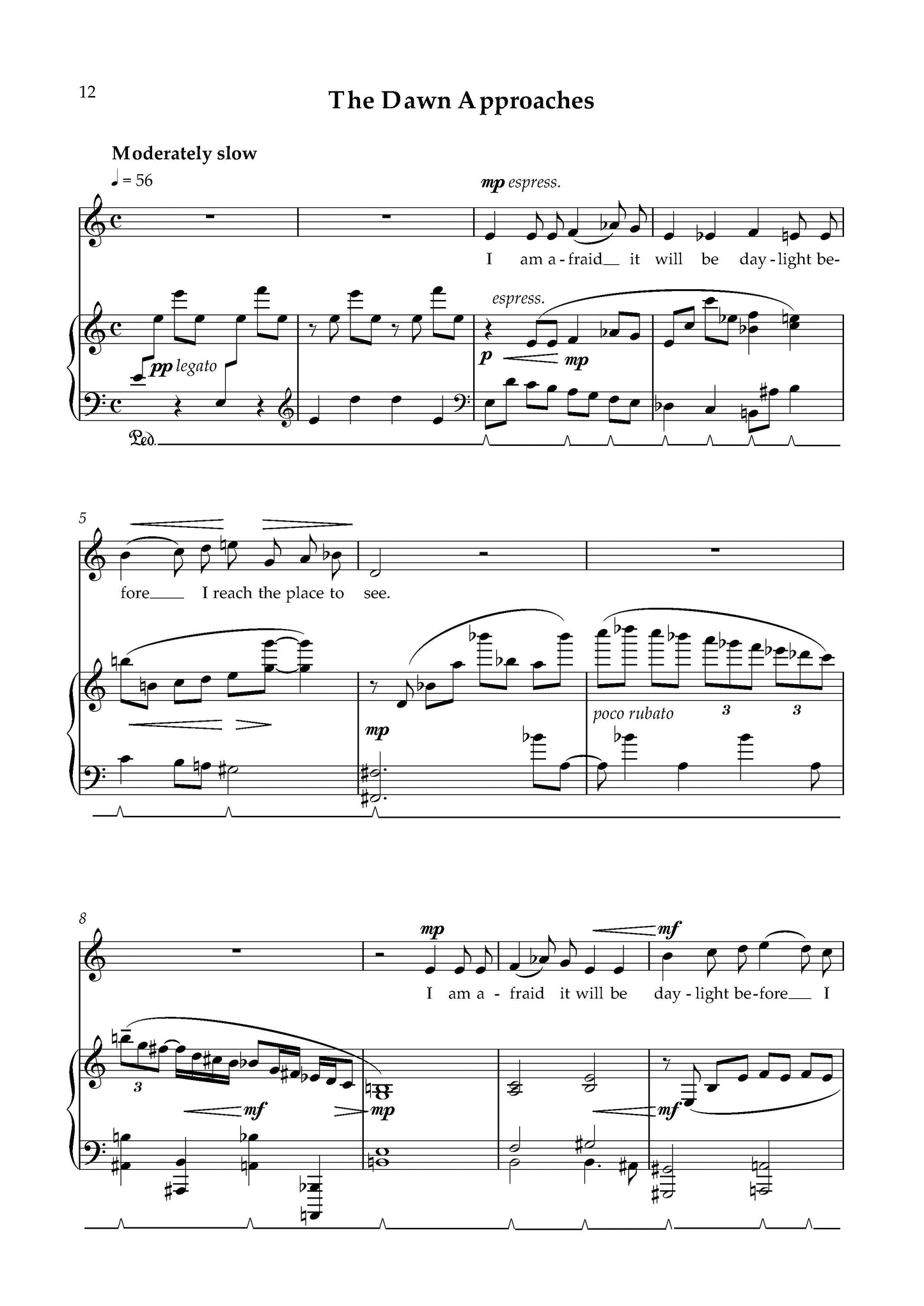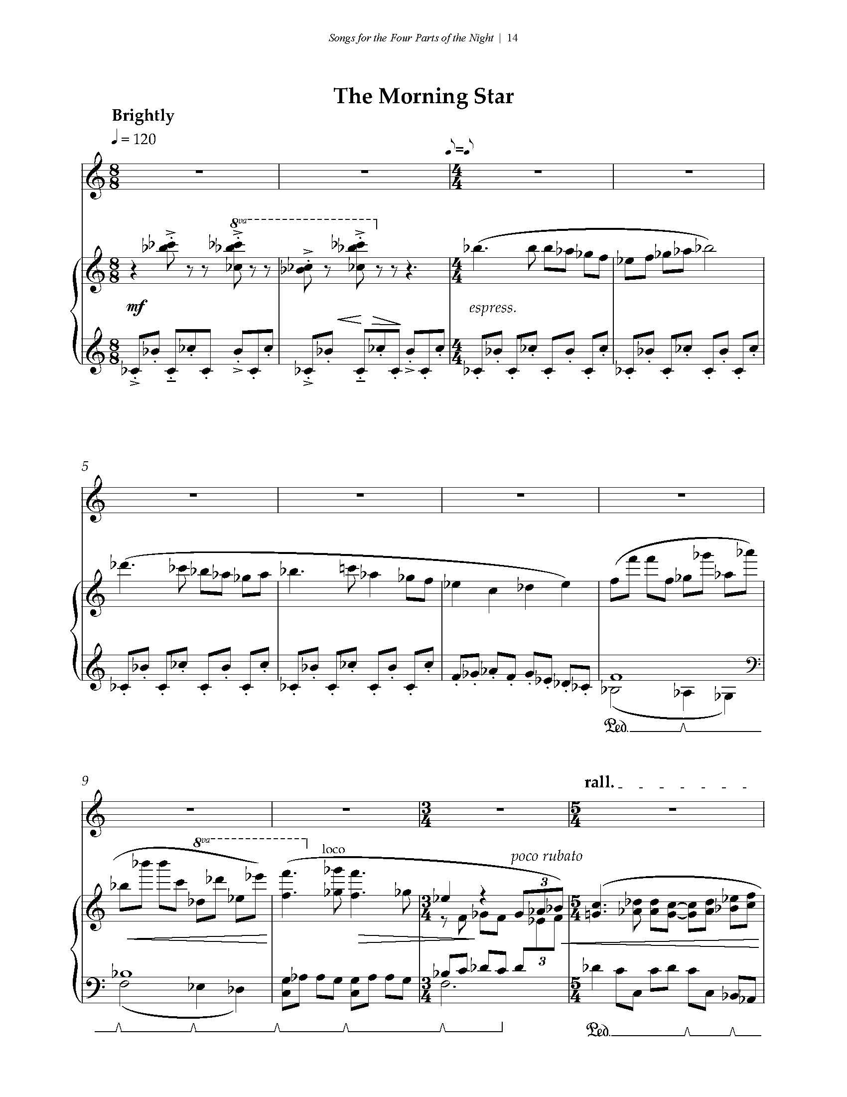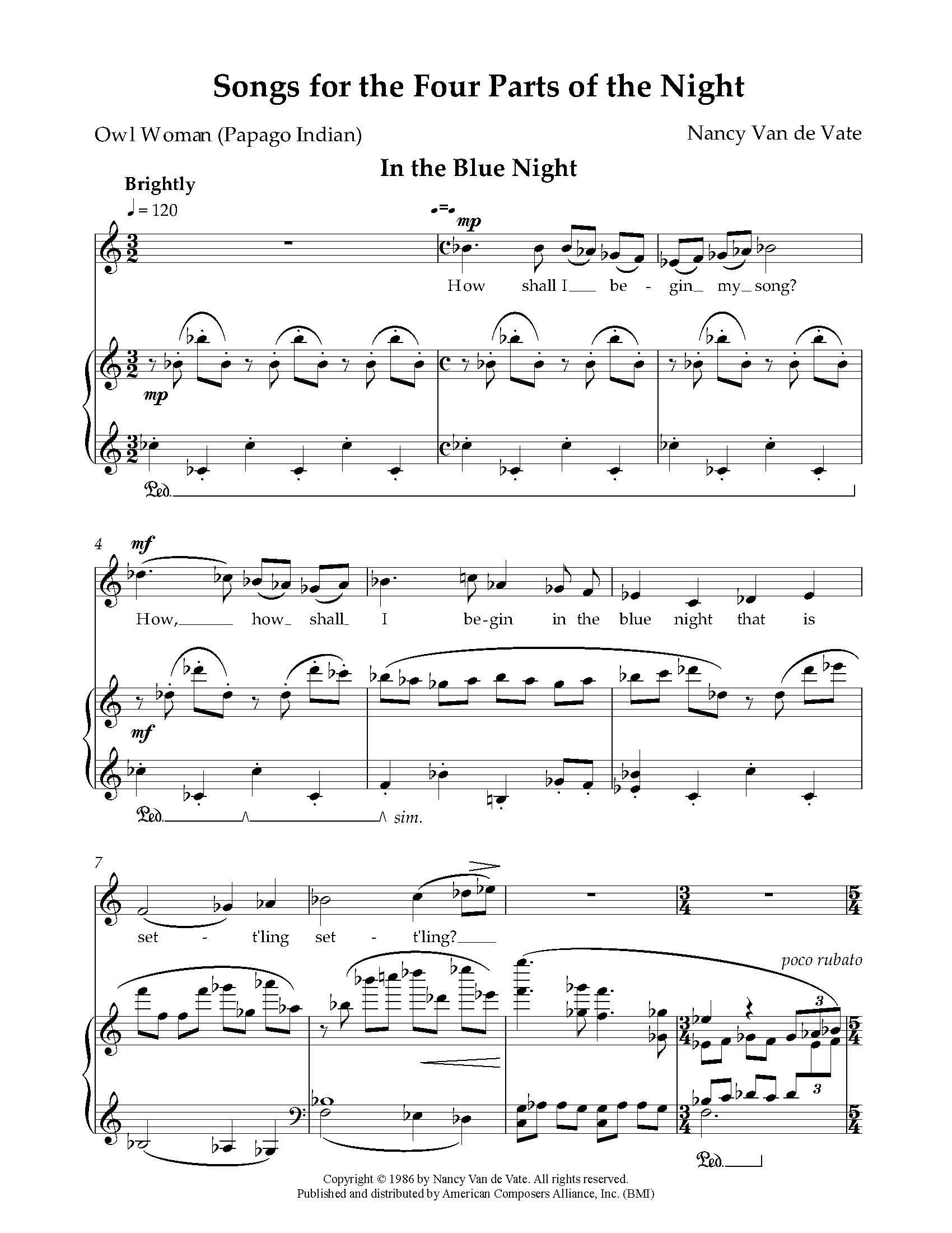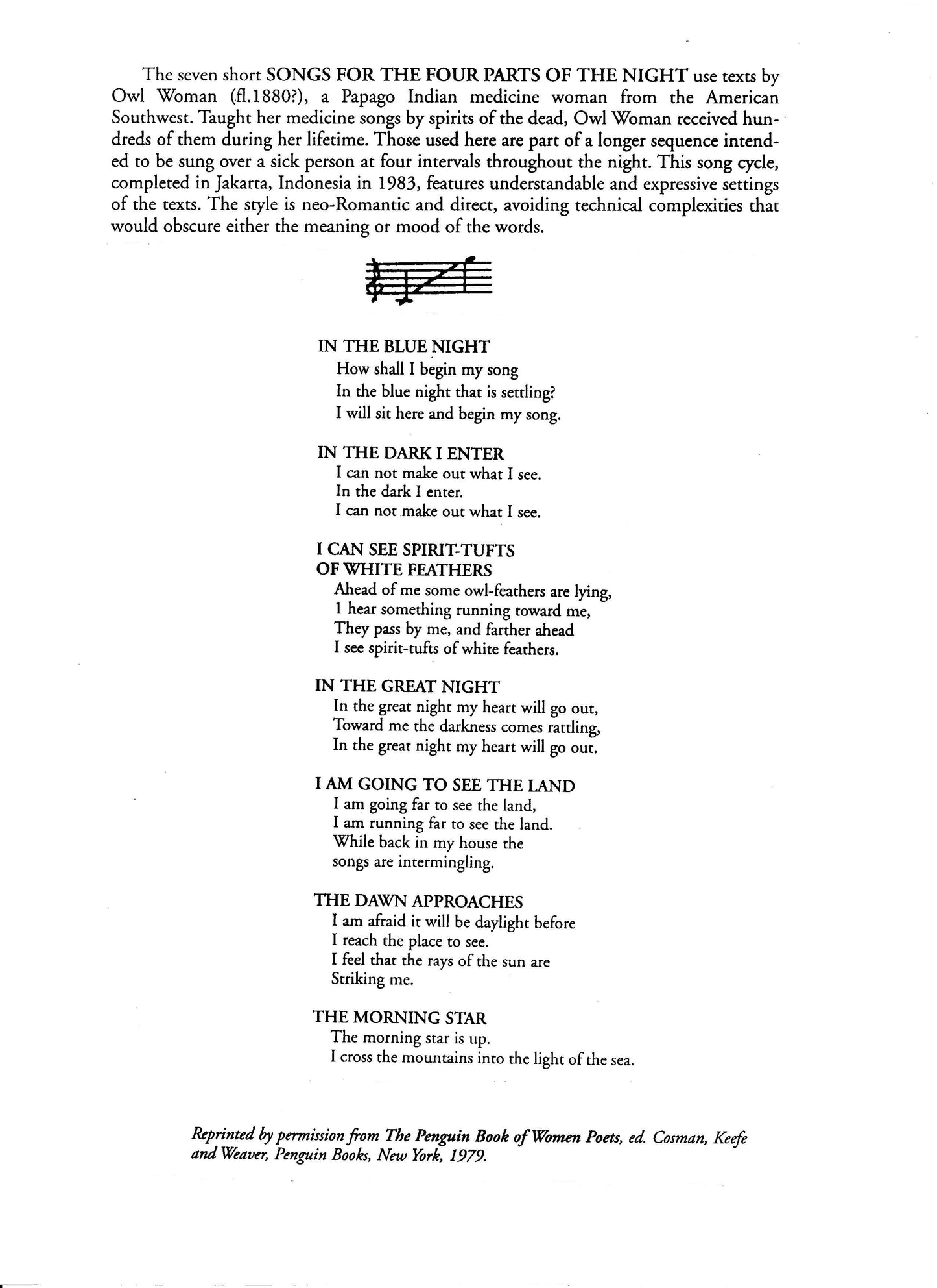 The seven short SONGS FOR THE FOUR PARTS OF THE NIGHT use texts by Owl Woman (fl.1880?), a Papago Indian medicine woman from the American Southwest. Taught her medicine songs by spirits of the dead, Owl Woman received hundreds of them during her lifetime. Those used here are part of a longer sequence intended to be sung over a sick person at four intervals through the night. This song cycle, completed in Jakarta, Indonesia in 1983, features understandable and expressive settings of the texts. The style is neo-Romantic and direct, avoiding technical complexities that would obscure either the meaning or mood of the words.