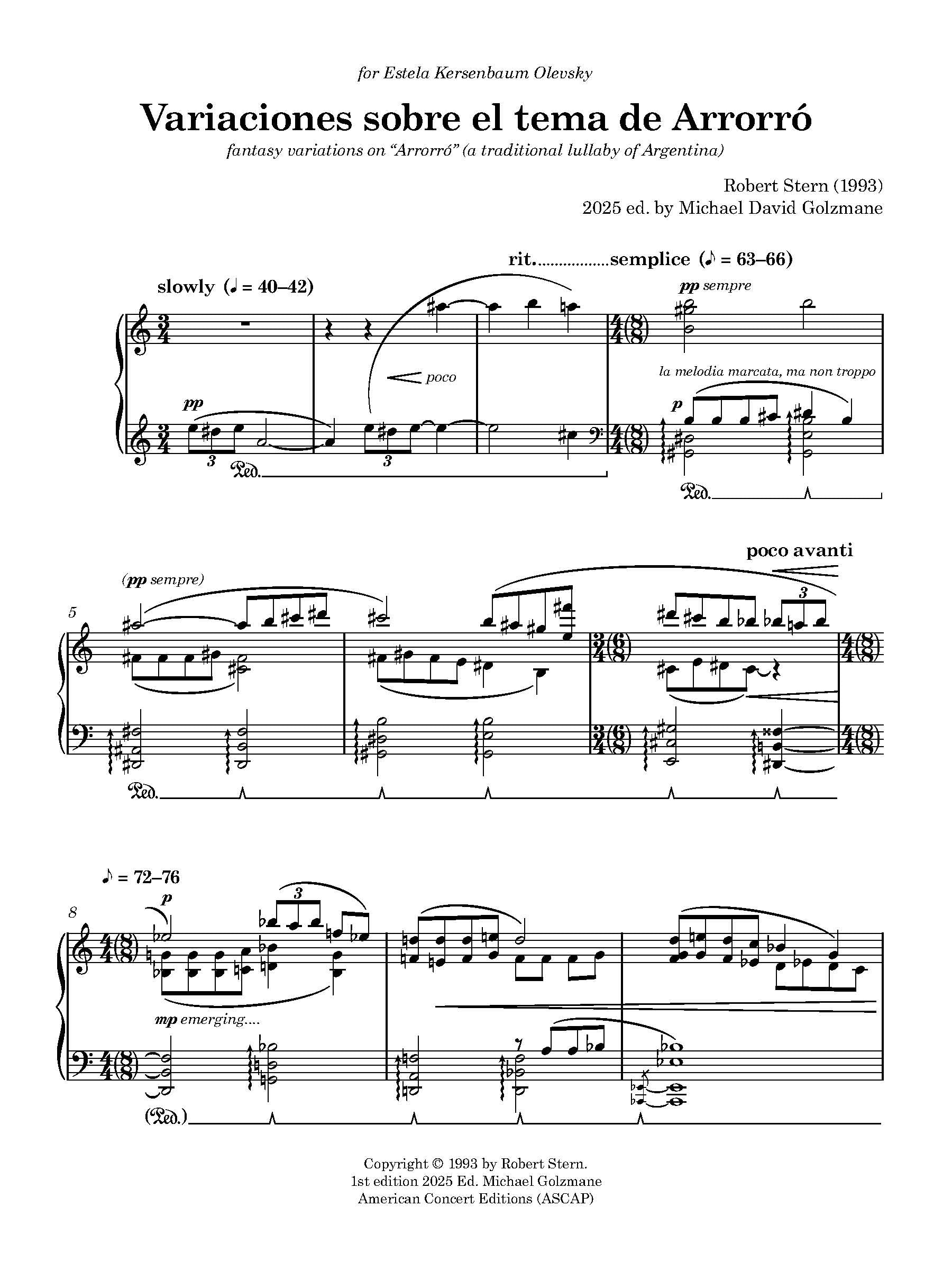 Olevsky, born and raised in Argentina, studied composition with Ginastera before moving to the United States, where she became professor of piano at UMass/Amherst for more than 30 years. As Olevsky recalls: “The folk tune Arrorró is a well-known Argentinian lullaby. I sang it for Bob [Stern] and he liked it. I had recently become a grandmother and enjoyed singing this tune to my grandchildren when they were babies.”