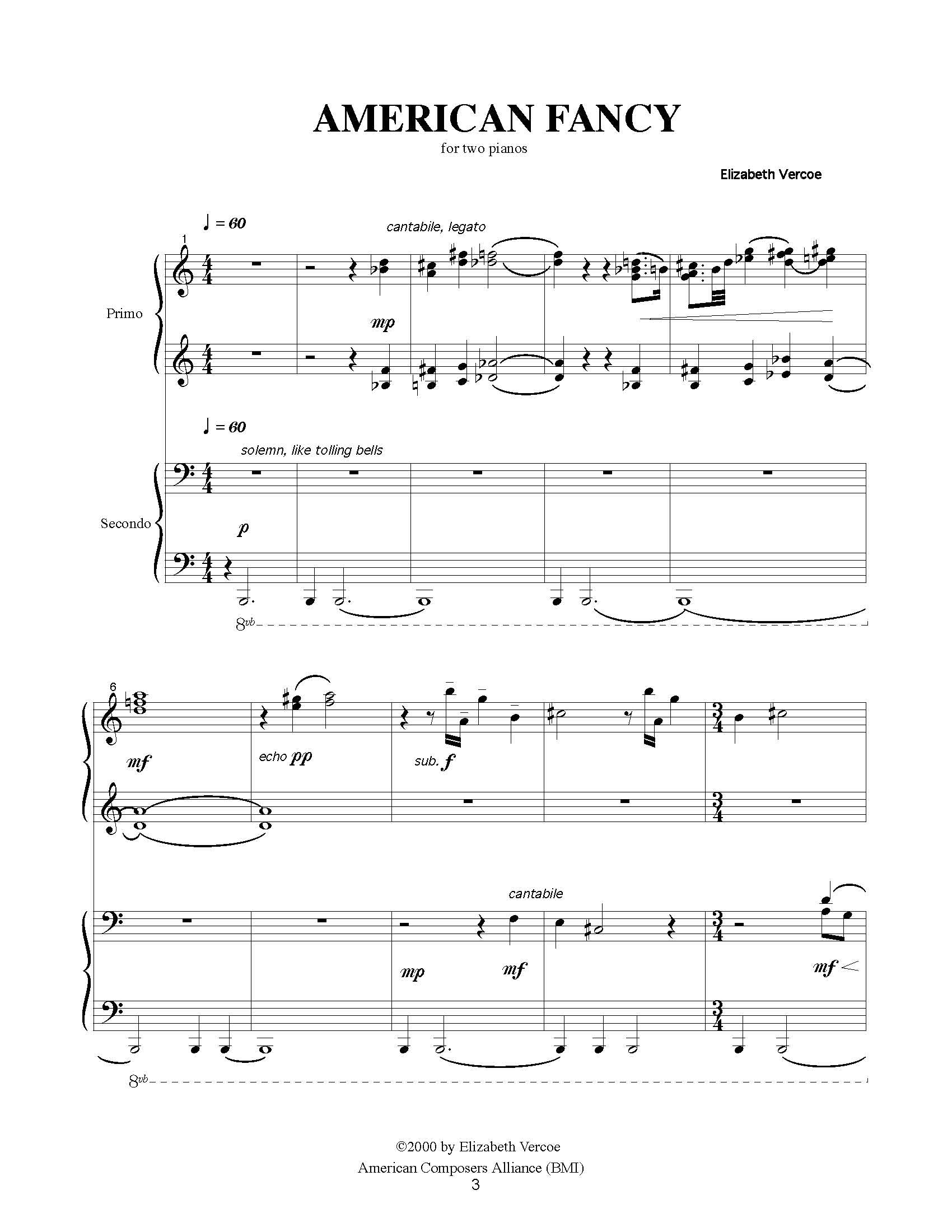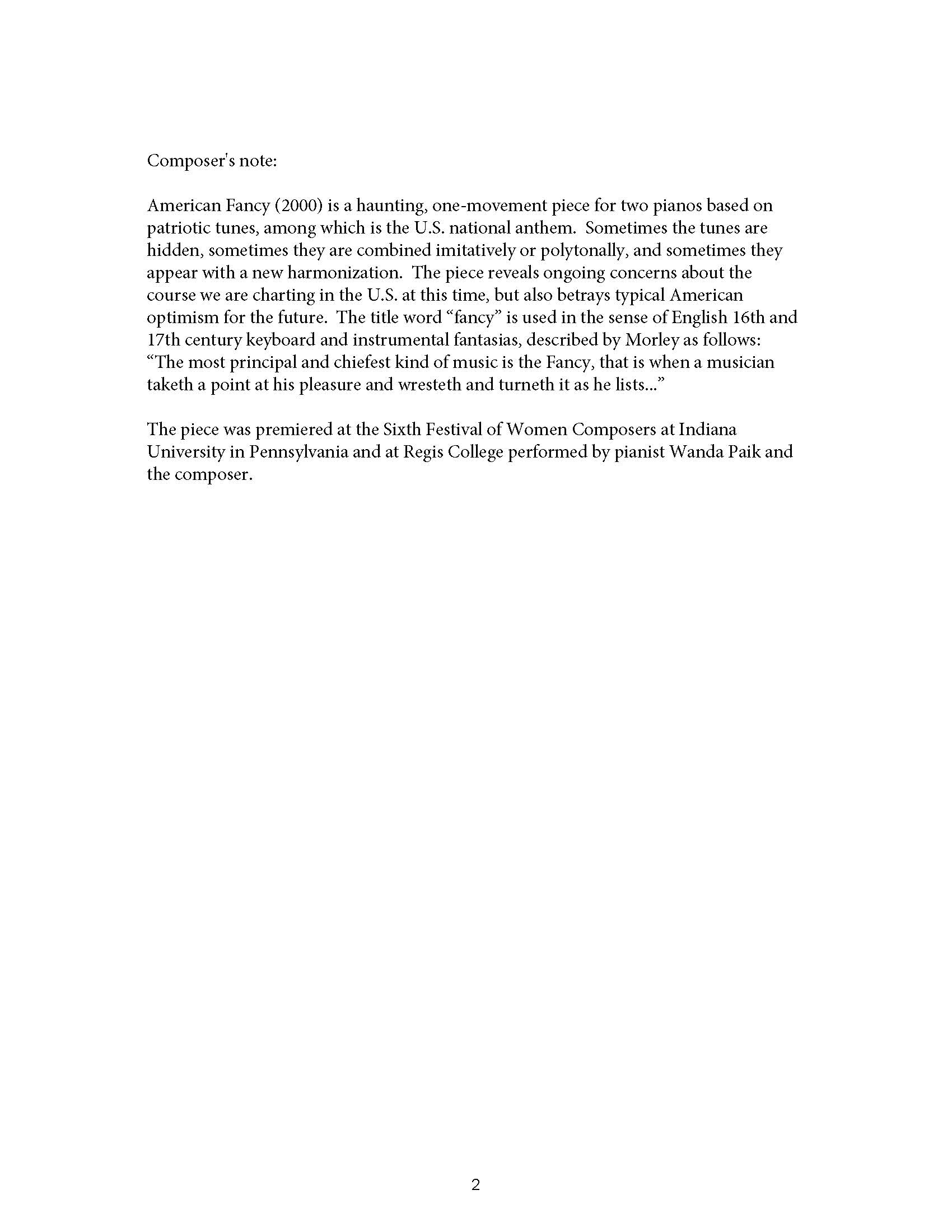 American Fancy (2000) is a haunting, one-movement piece for two pianos based on