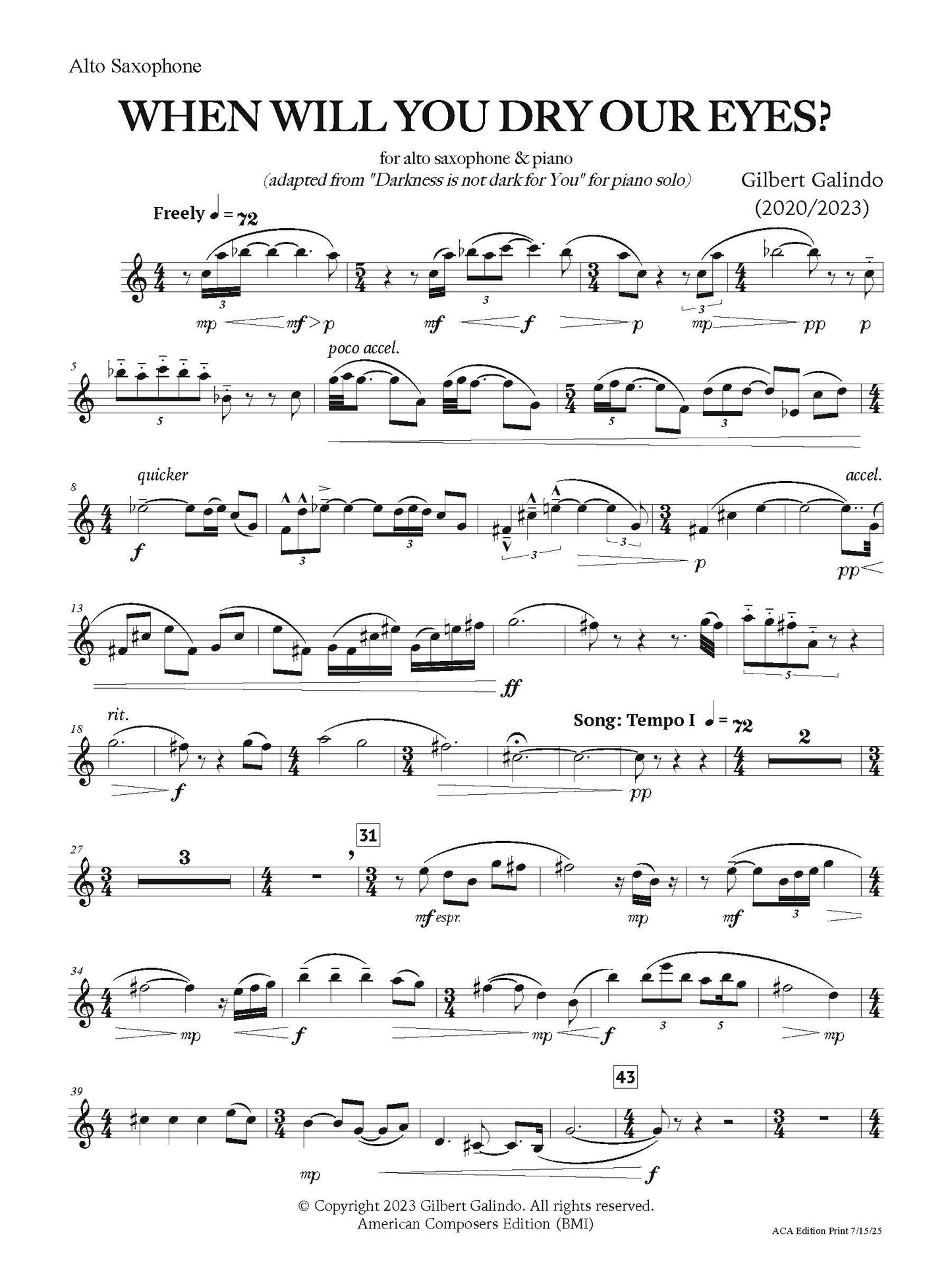 "When will You dry our eyes?" for saxophone and piano is adapted from the lyrical heartfelt song variation section of "Darkness is not dark for You" for solo piano with hints of mystery and hope.