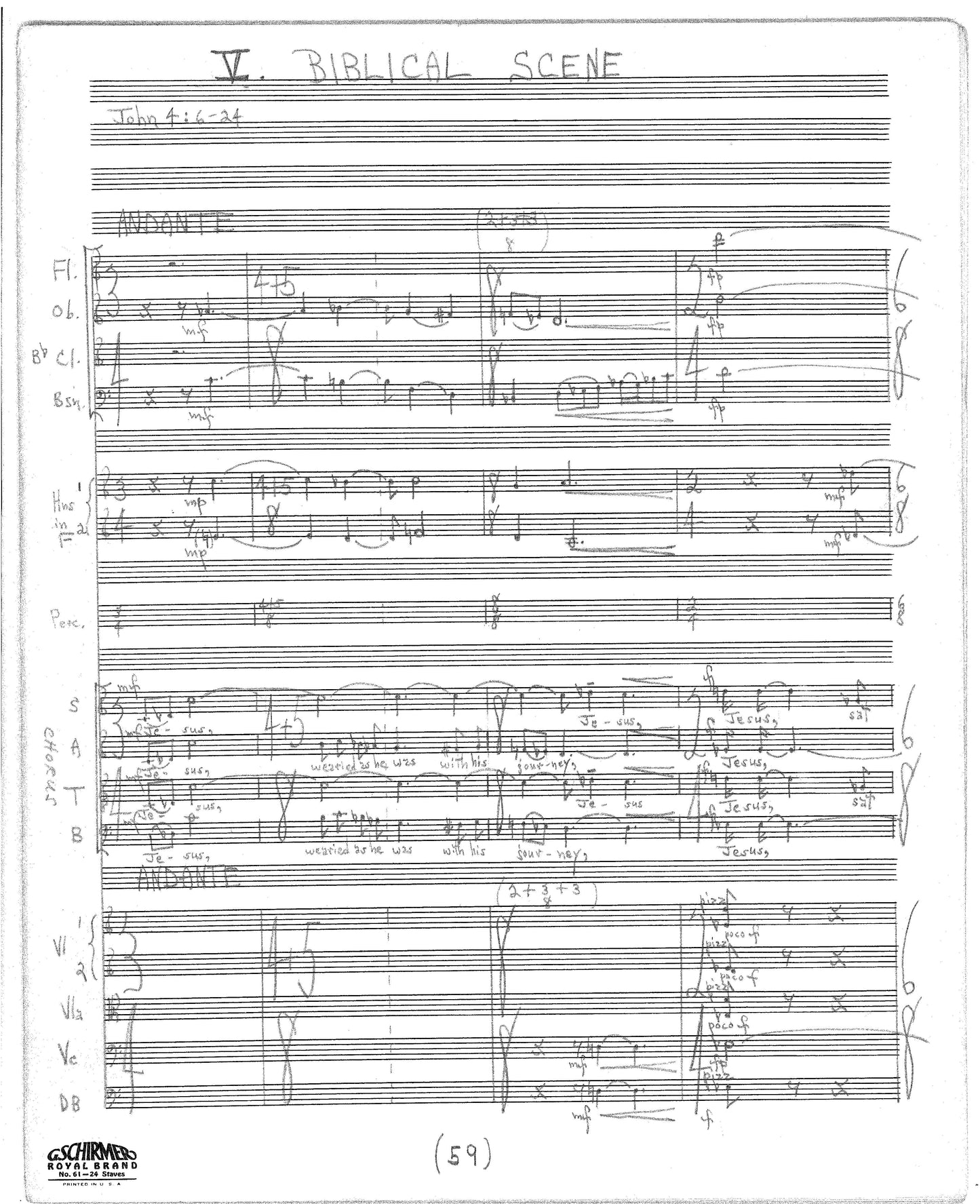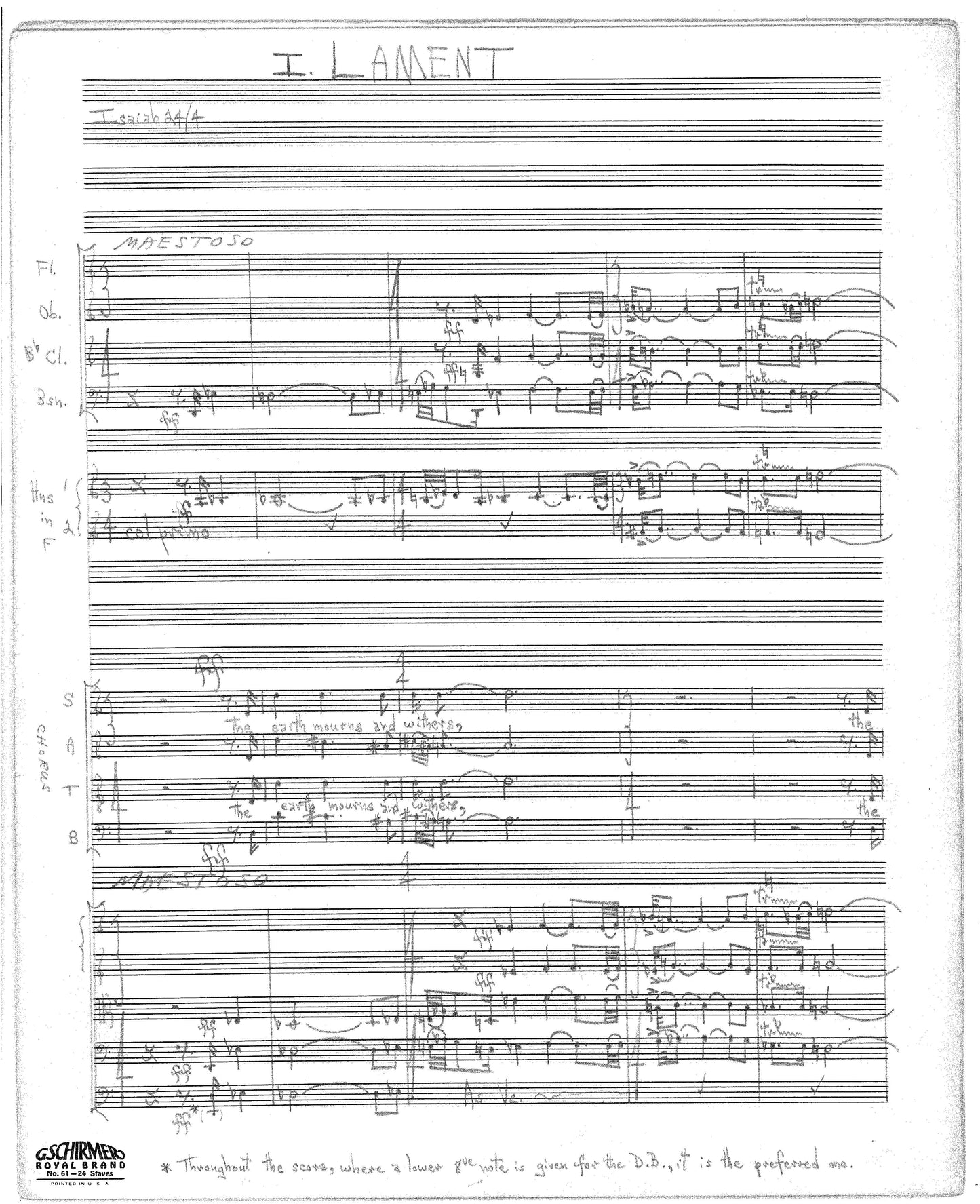 Soprano solo, baritone solo, SATB, flute (1), oboe (1), clarinet (1), bassoon (1), horn (2), timpani, percussion, strings