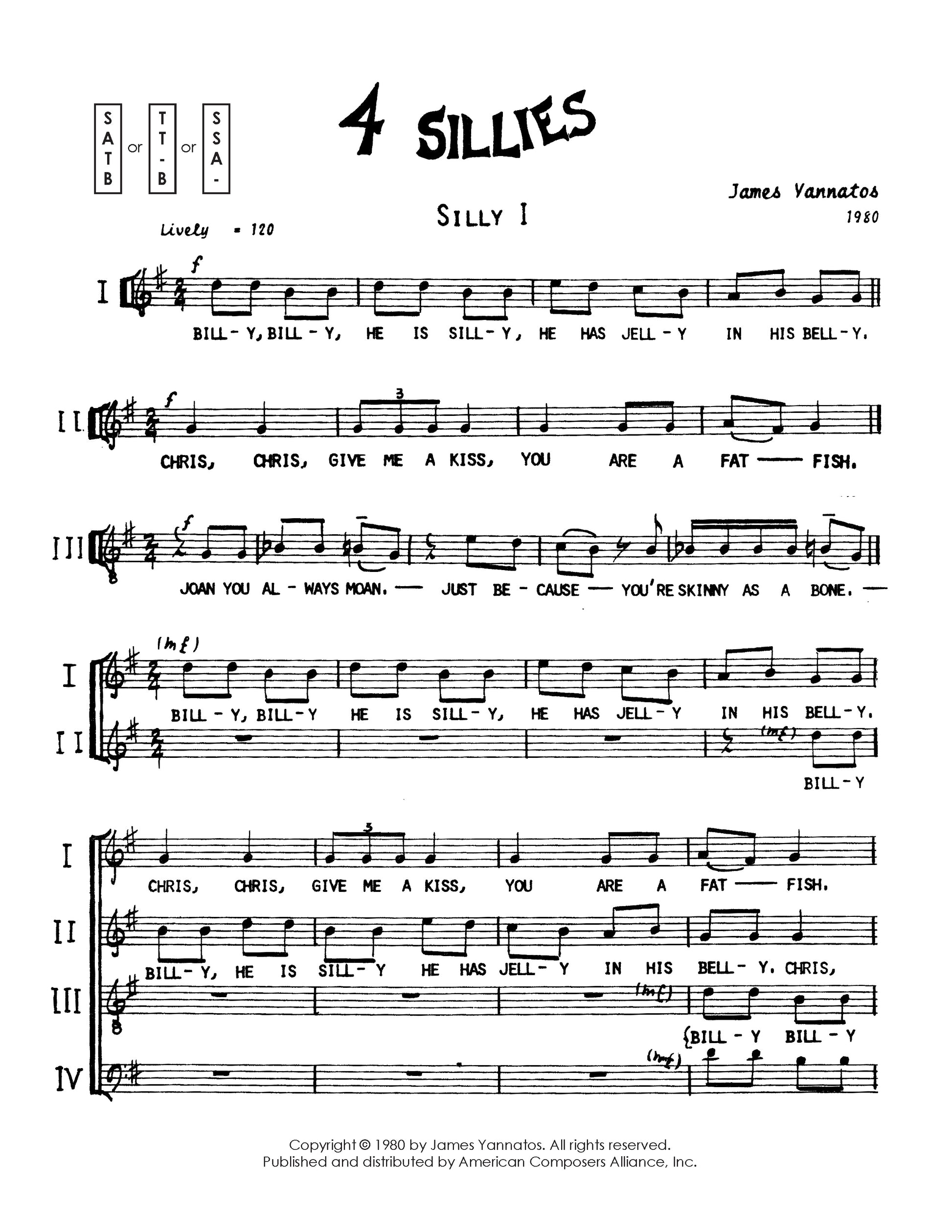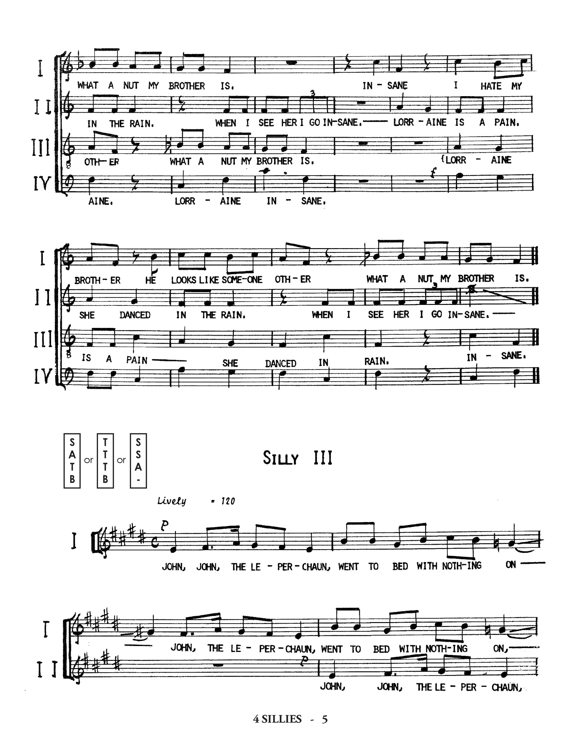 4 Sillies can be sung in various ways. The parts, designated “I, II, III, IV,” can be sung as indicated above each song, SATB or TT-B or SSA-, etc., depending on the available voices. The director should also feel free to choose other groupings to create a fresh, spontaneous effect, and to transpose any Silly due to range considerations. In women’s chorus, the tenor can be sung an octave higher.