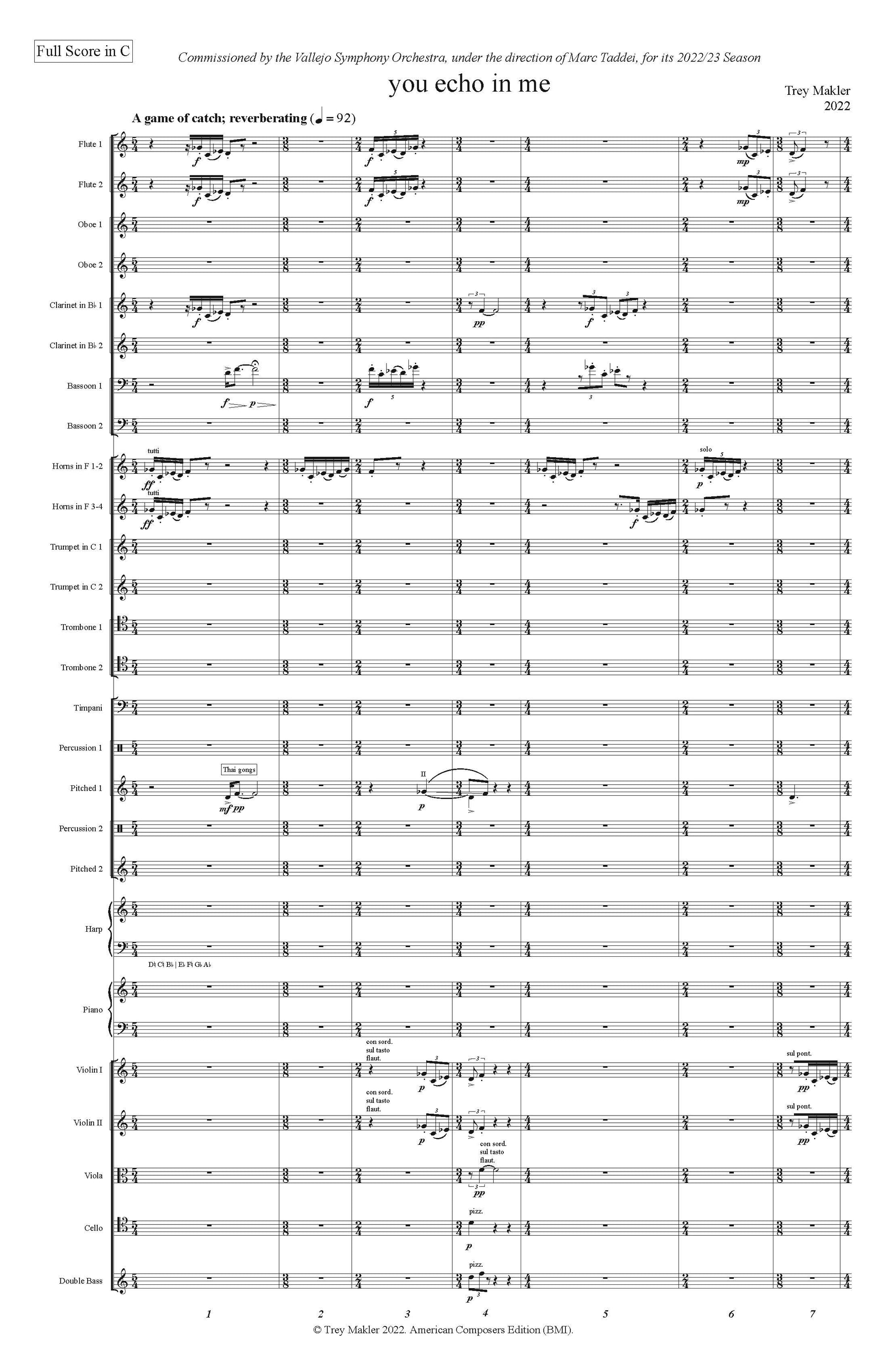 The idea for this piece came to me following sustained research in queer theory and the AIDS crisis. I found myself fascinated by the mutability of identity and the impact of accumulated histories on the way one lives their day to day life: how does one forge their own space in a community, and how do communities become coalitions united through individuality and difference? you echo in me explores these questions through the orchestra, figured as its own community, a musical microcosm of difference in not only the union of various instrument families, with players trained to blend and commit to the singular goal of the ensemble, but also in the musical situation of different humans gathering in a space to work together, thus overcoming difference through collectivity.