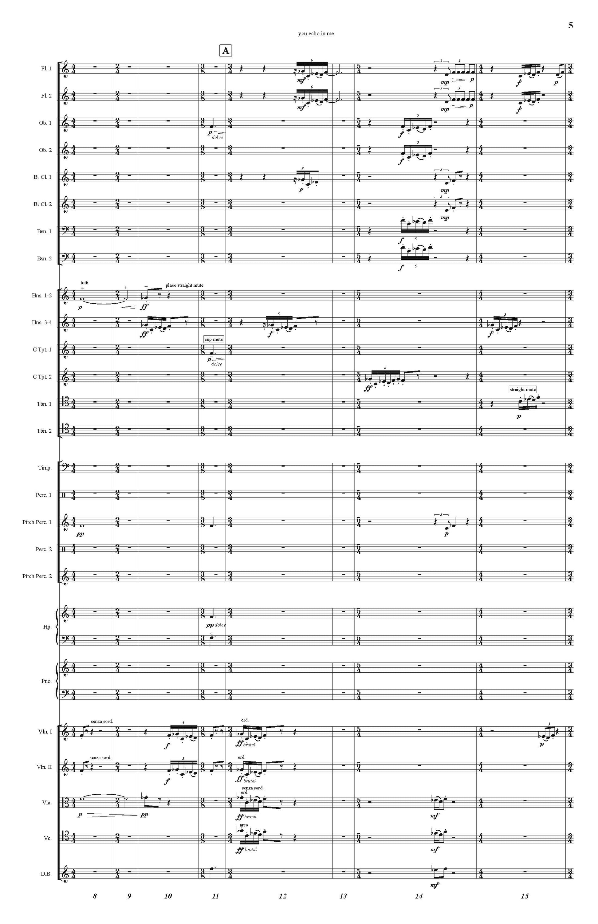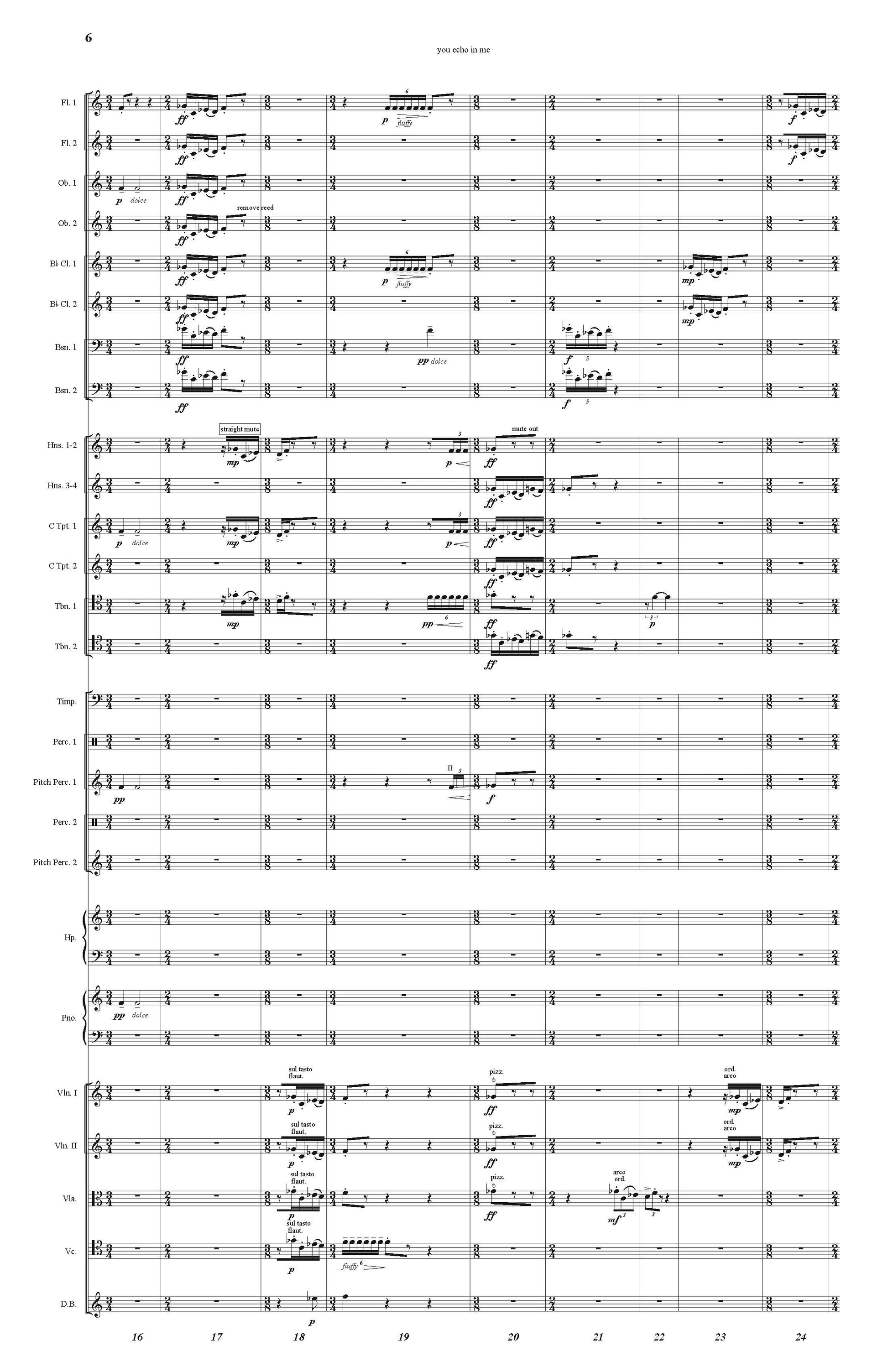 As the title suggests, you echo in me uses echoes as its primary expressive language. I imagined what might happen if different parts of the orchestra were contained by glass cloches, forming a variety of echo chambers, each with different rules and behaviors. In some cases, musical materials reverberate as near exact replicas, displaced in time. Other situations hear the echo coming undone, with melodies falling apart as they are passed across the ensemble. Melodies are the backbone of this work, and through layering and counterpoint, generate the harmonic language of the entire piece. The result is music that is far more horizontal than vertical, with every gesture pointing towards the future. The piece opens with a game of catch, as the melody is handed off rapidly between players. At first, doubling occurs at the perfect unison, challenging the ensemble to work together to create one long, seamless line. Microtonal trills and subtle pitch bends erode the unison line, and in doing so draw attention to the minute differences and imperfections of unison playing. Gradually, these gestures grow into larger bends and wider trills, with rhythmic and temporal variations transforming melodic lines into smears of clouds, bursts, splatters, and sparkles.