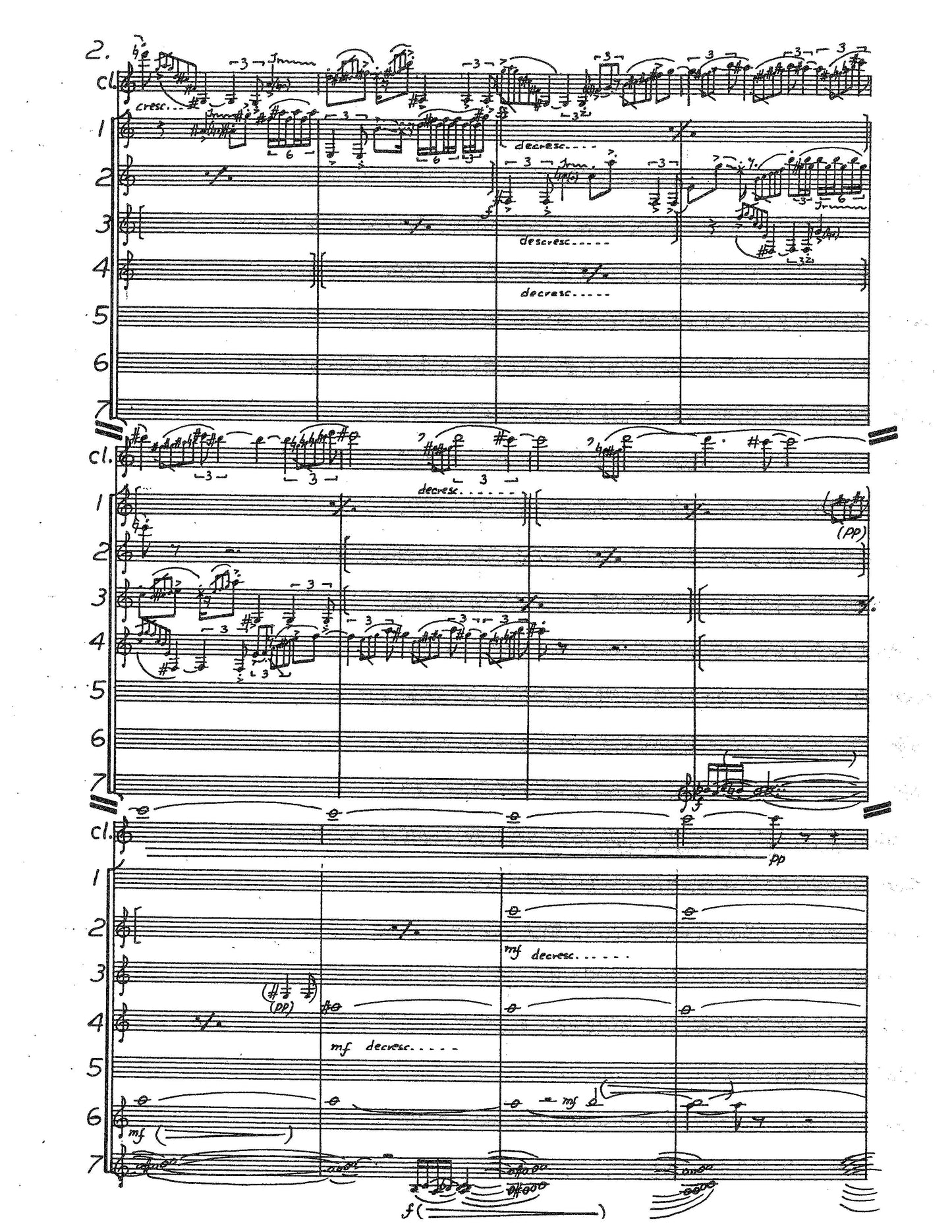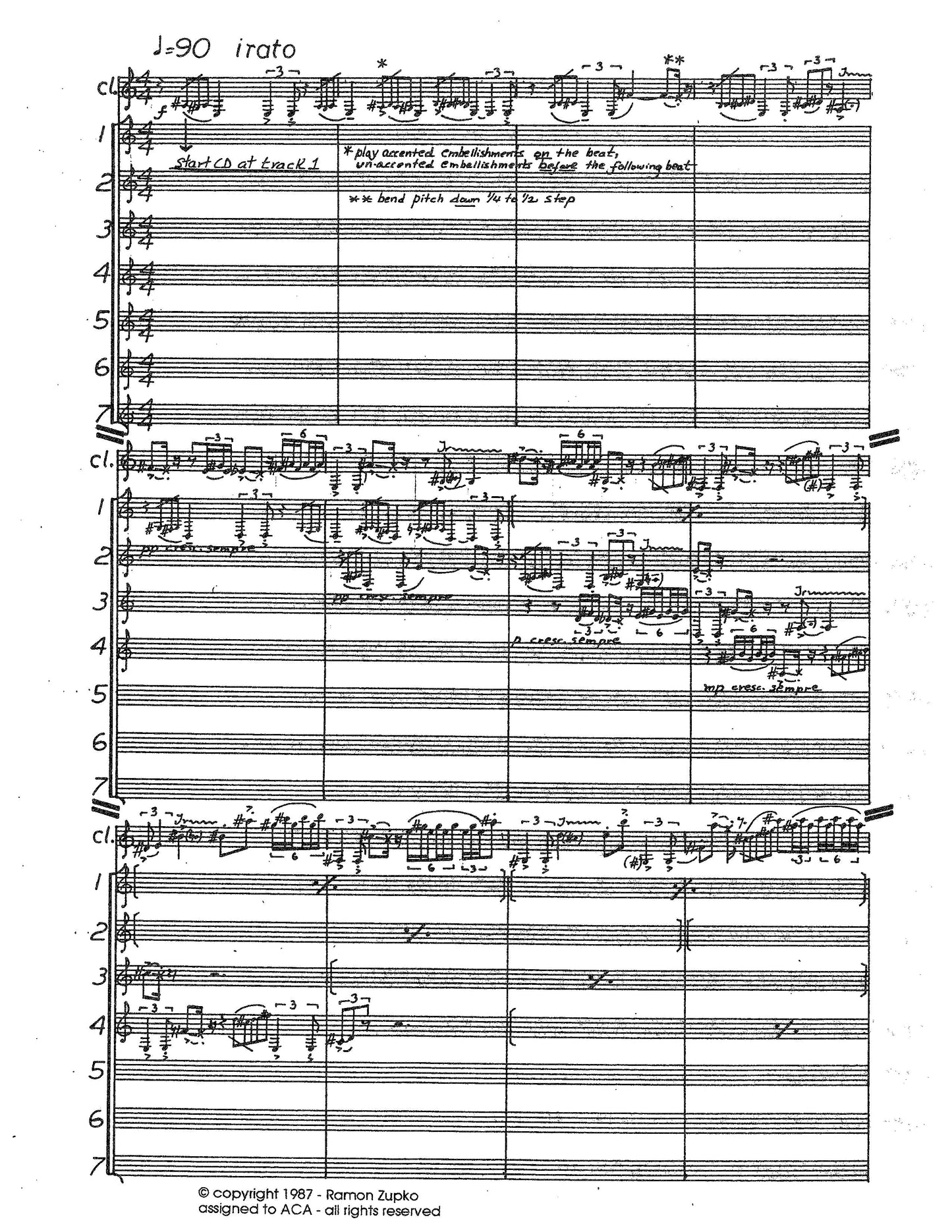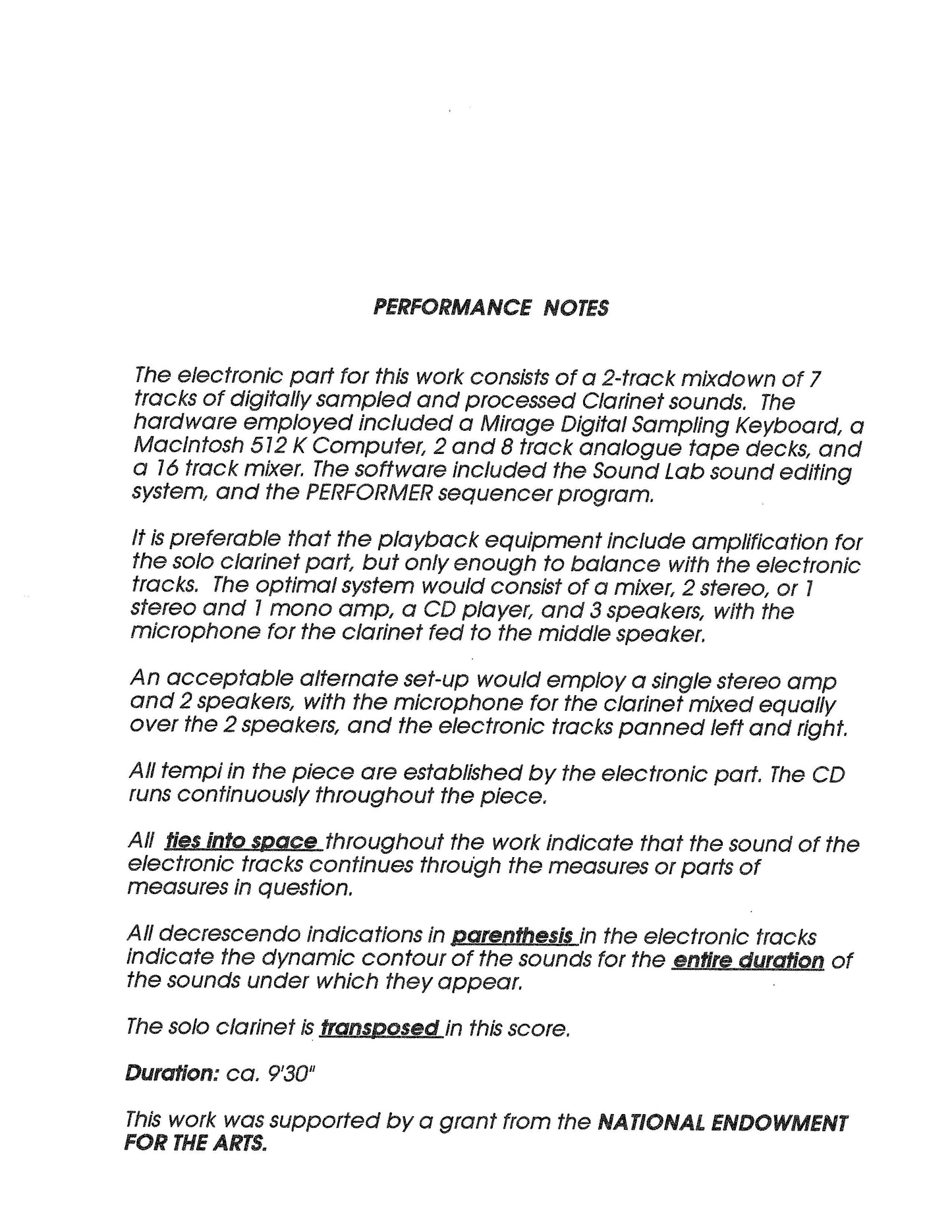 All of the electronic sounds in this work are samples of clarinet sounds, transformed with a mirage digital sampling keyboard. Most sections of the piece are a study in rapid ornamentation, in both the solo and the electronic tracks, of melodic materials introduced at the beginning. High difficulty - advanced performer only.