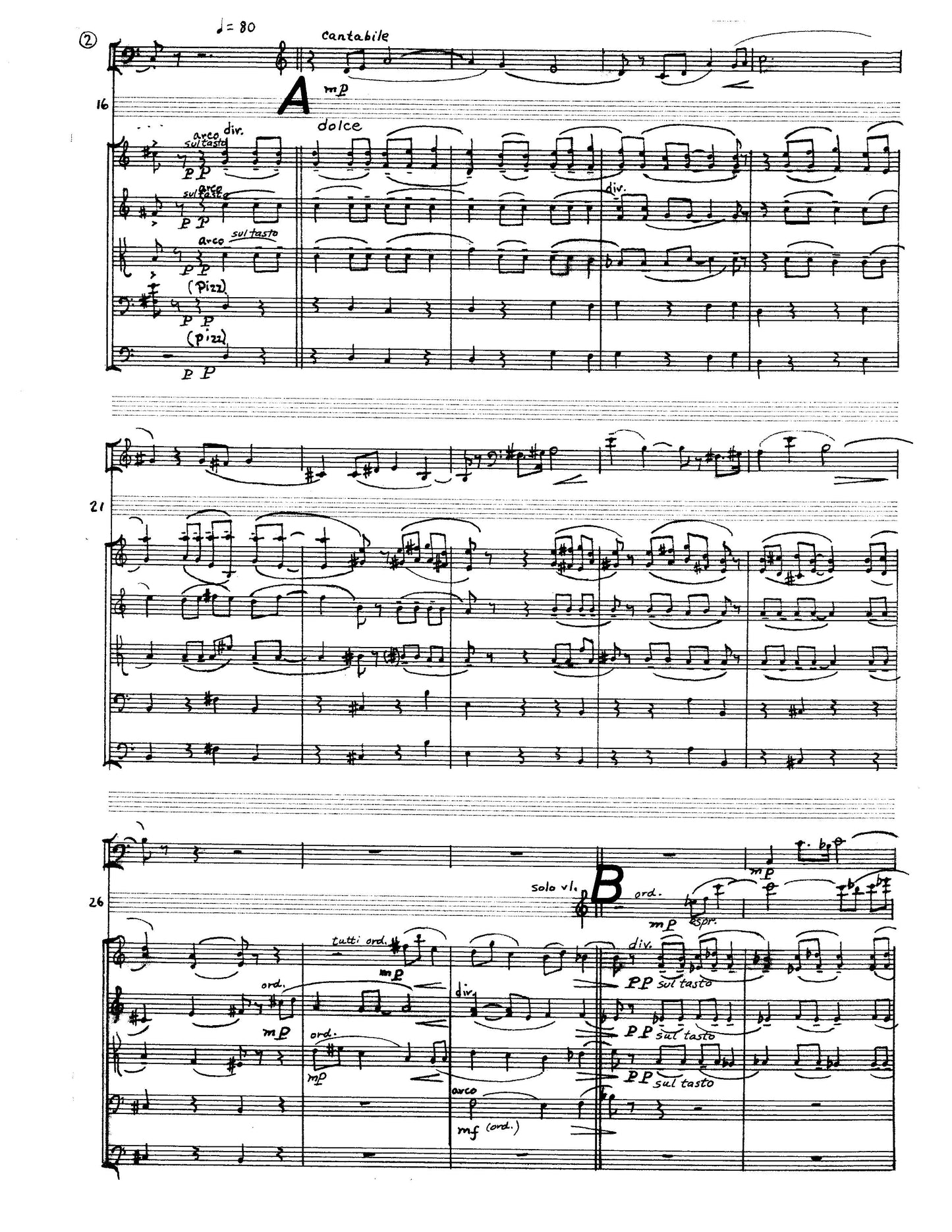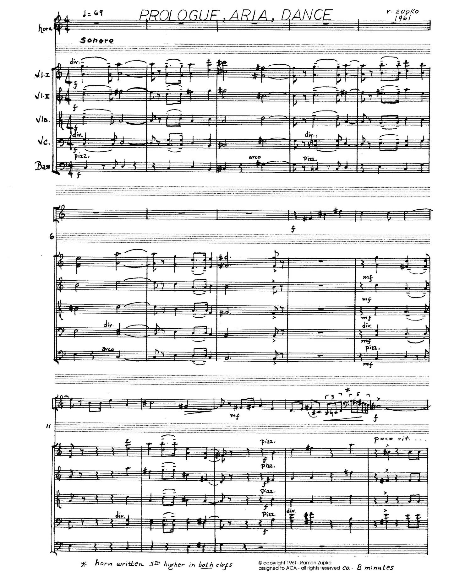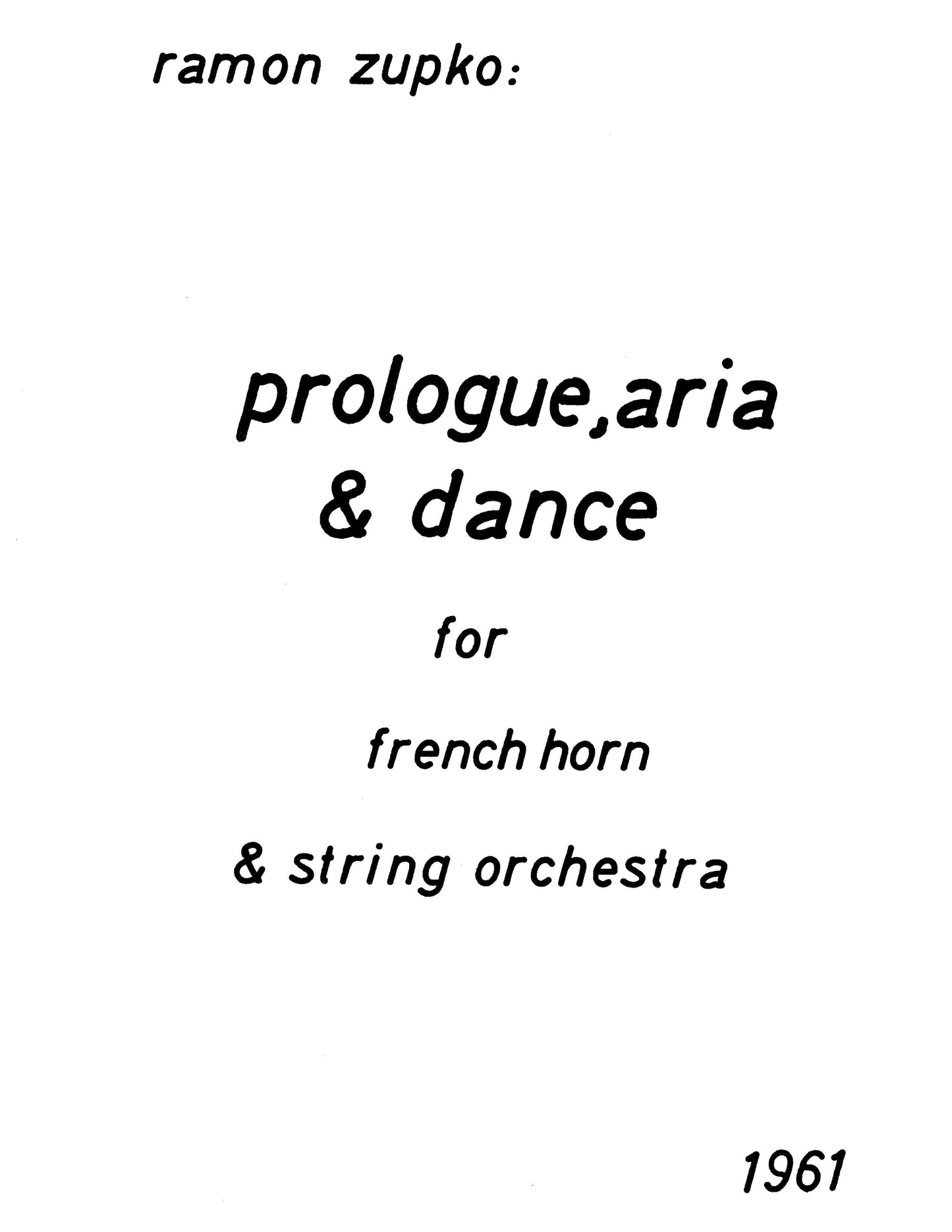A work for solo horn and string orchestra, in three continuous sections contained within a single movement. The brief prologue features widely spaced string sonorities and a declamatory horn part; the aria is more lyrical, with momentary references to the prologue; the dance is driving and rhythmic, with a good deal of syncopation. The music of the prologue makes another brief appearance before the rushing coda. Difficult - suitable for college, community, or professional orchestras.